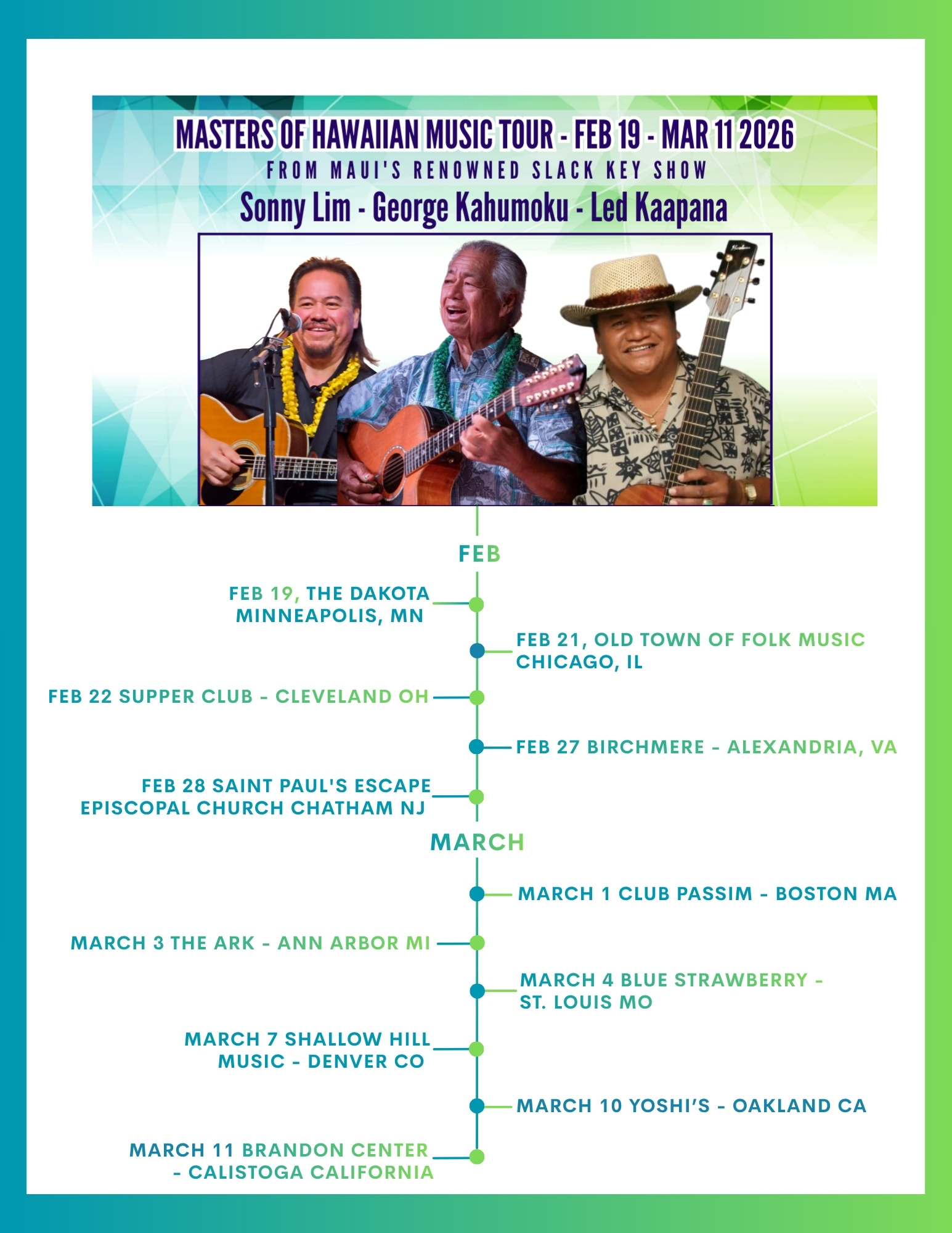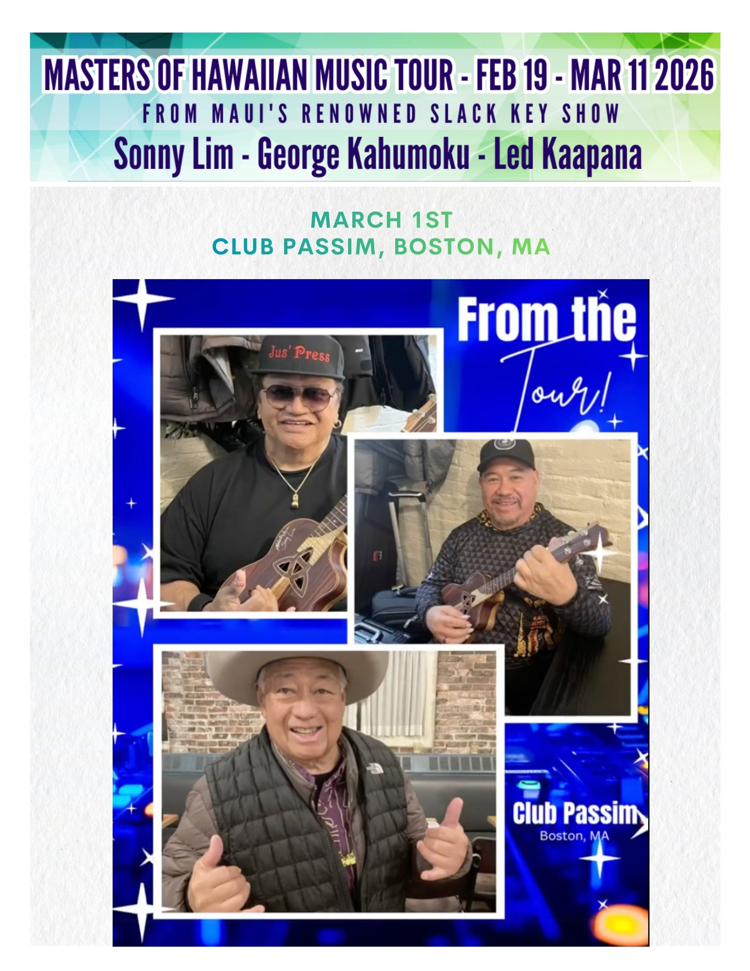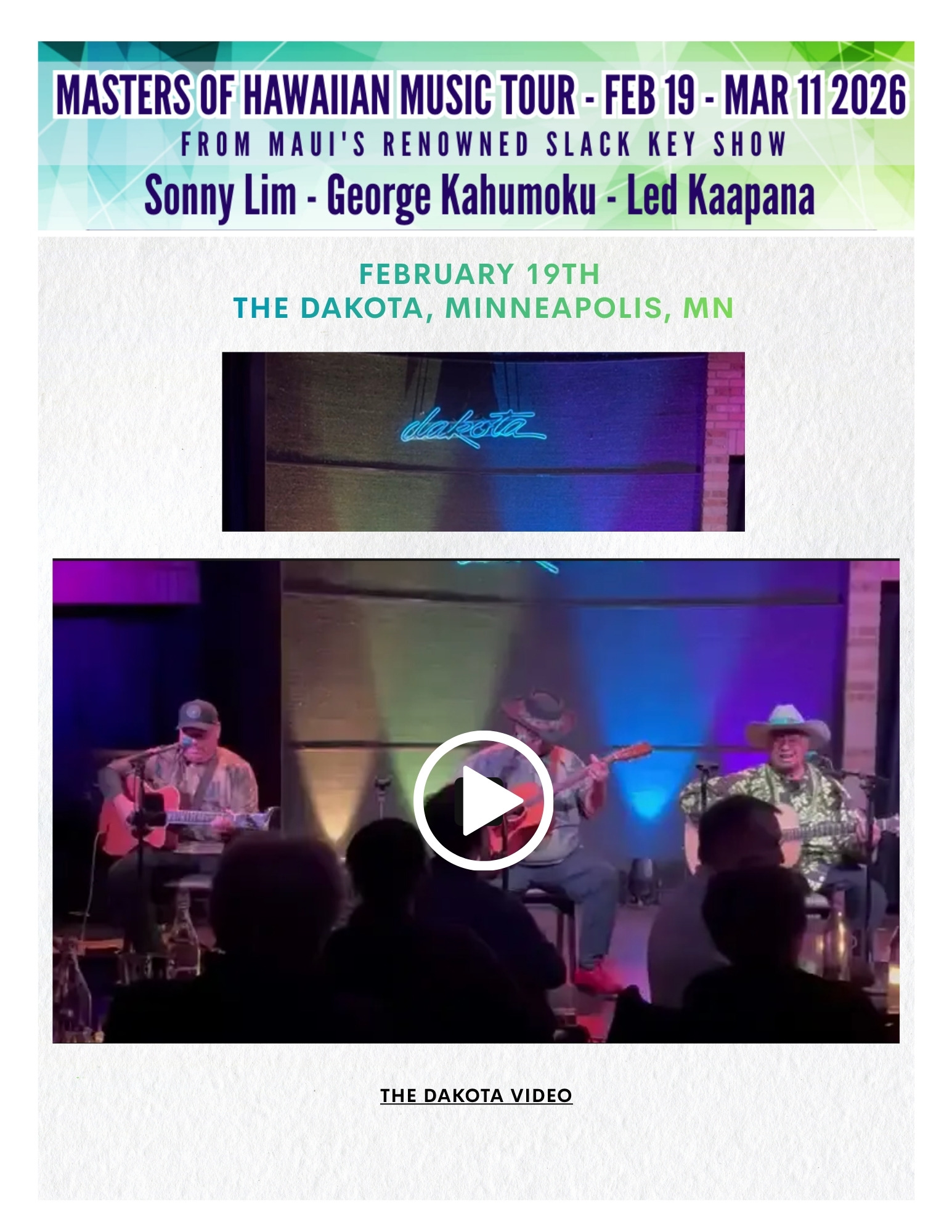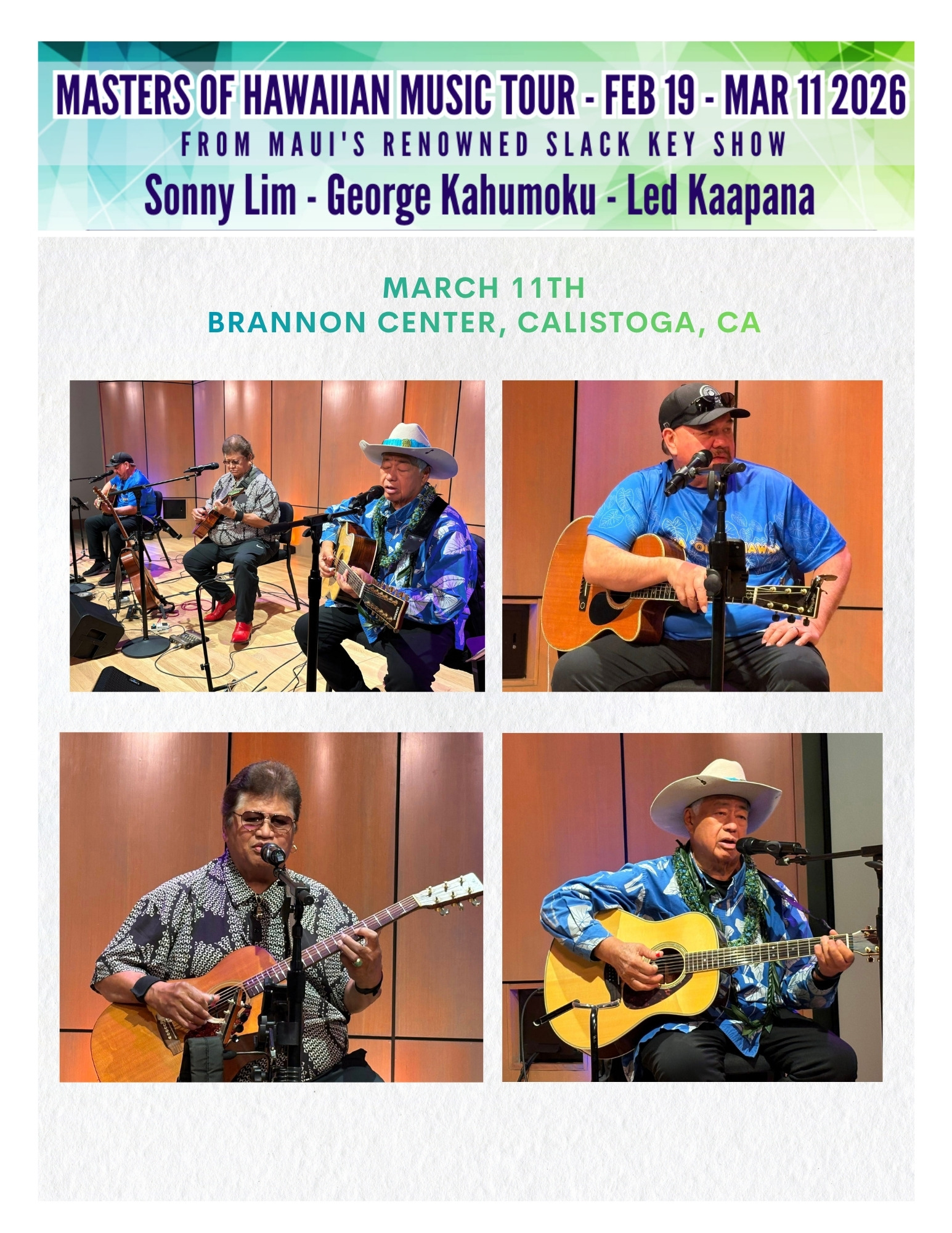 The 2026 spring tour of the Masters of Hawaiian Music carried the spirit of Maui across the continent, bringing the warmth of slack key guitar and storytelling to audiences from the Midwest to the West Coast. Kicking off in February with performances in Minneapolis, Wausau, Chicago, and Cleveland.