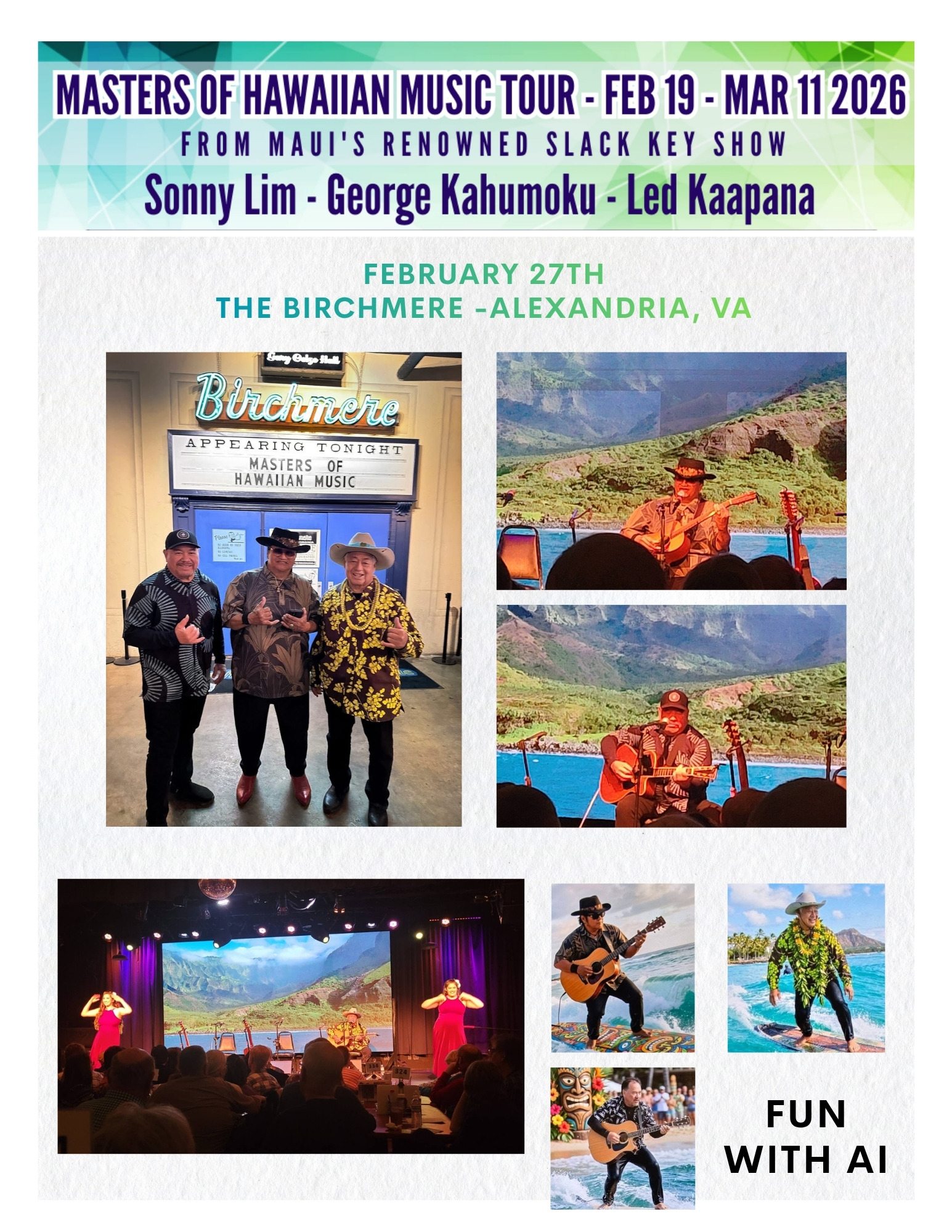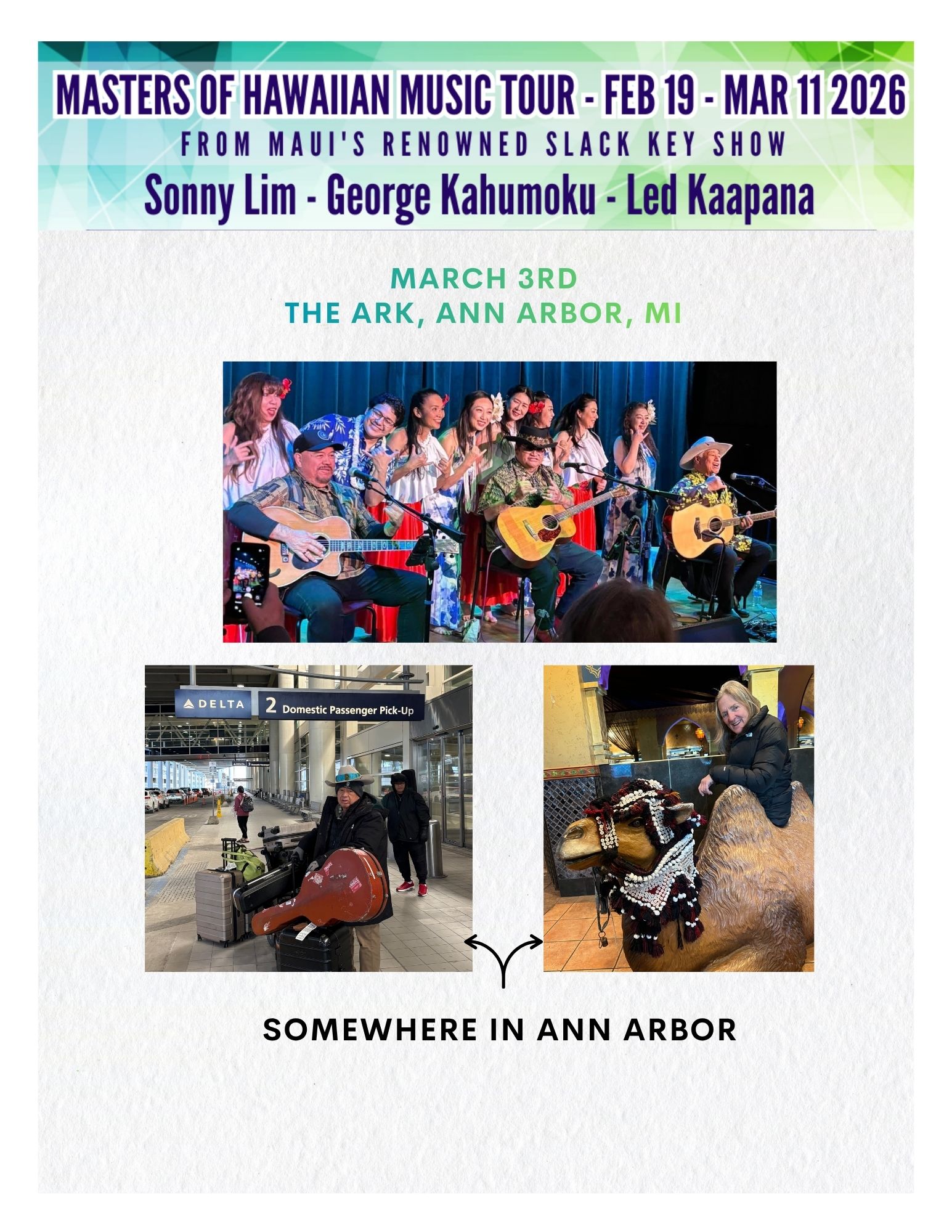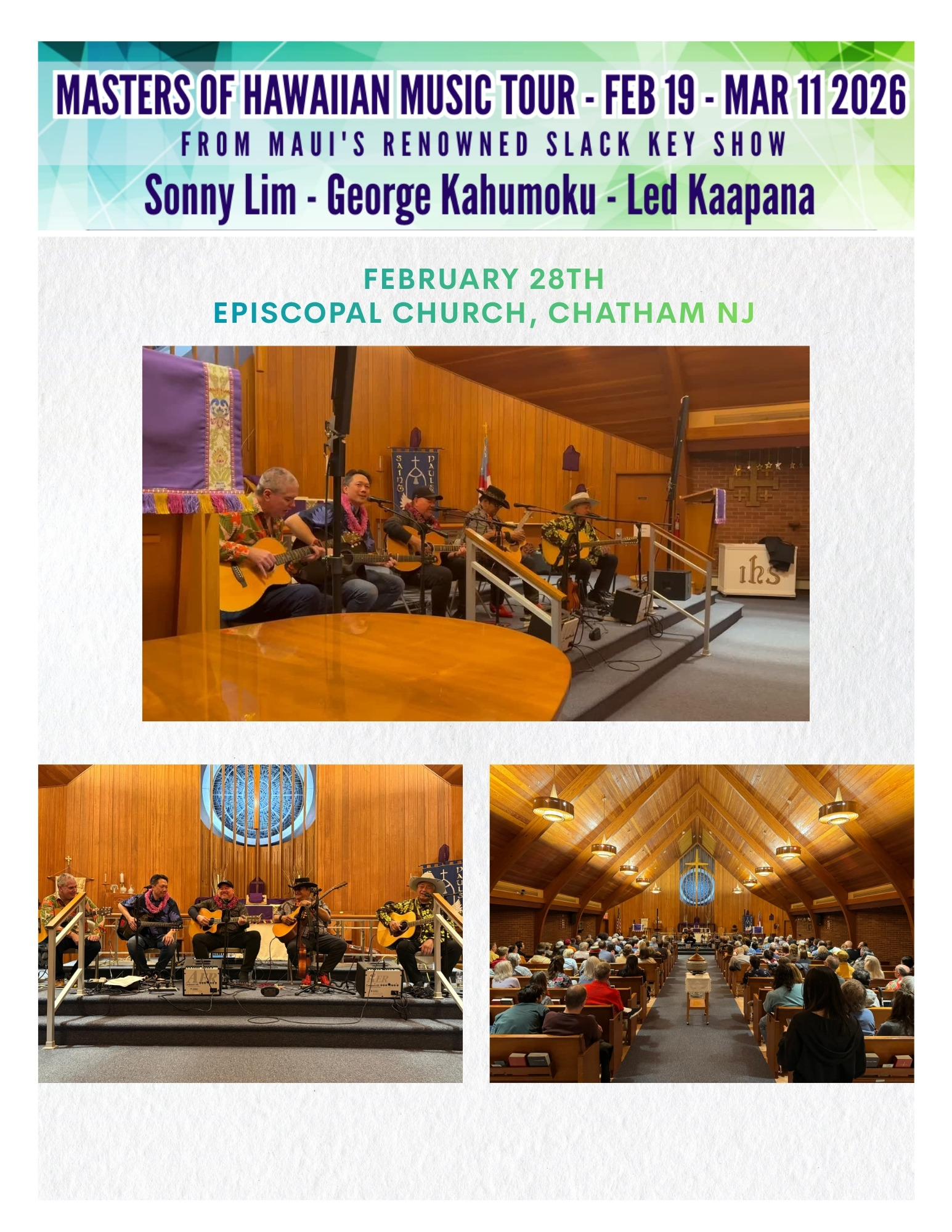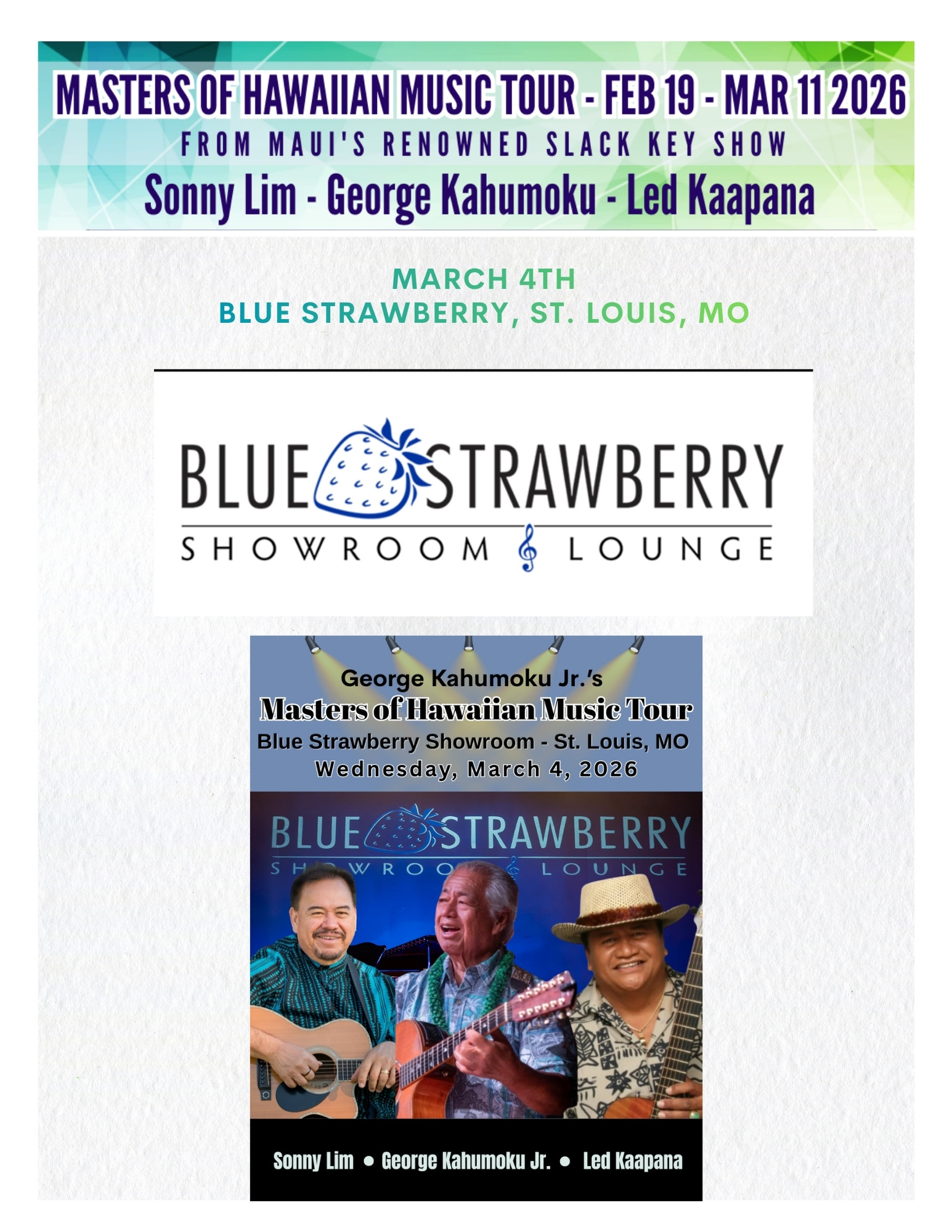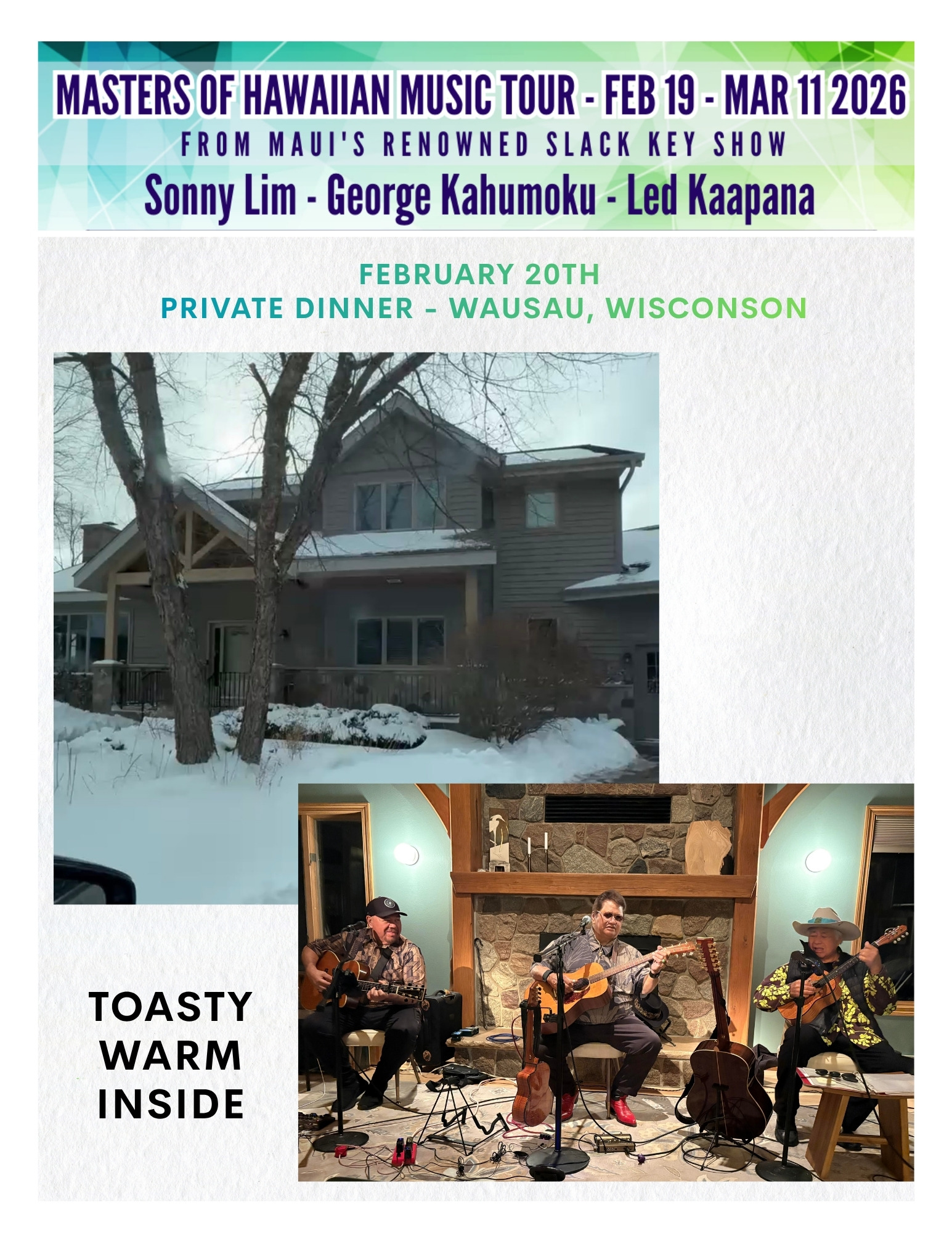 The 2026 spring tour of the Masters of Hawaiian Music carried the spirit of Maui across the continent, bringing the warmth of slack key guitar and storytelling to audiences from the Midwest to the West Coast. Kicking off in February with performances in Minneapolis, Wausau, Chicago, and Cleveland.