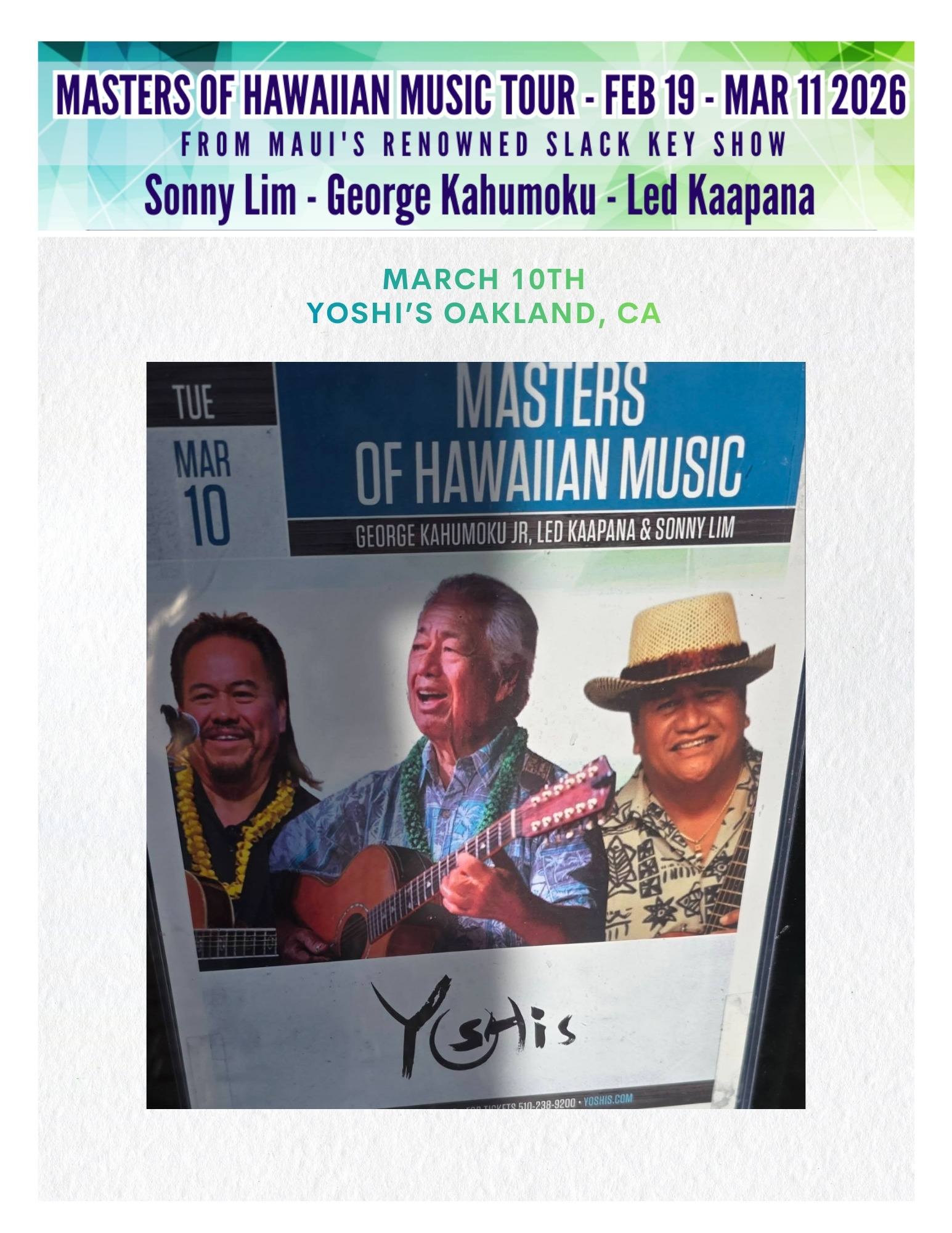 Along the way, George Kahumoku Jr., Led Kaapana, and Sonny Lim shared not just music, but stories, humor, and the deep cultural roots of Hawai‘i, creating intimate, heartfelt connections in every venue. Each stop was a reflection of the enduring strength of Hawaiian music. We united audiences, leaving behind a trail of aloha that continues to resonate long after the final note was played.